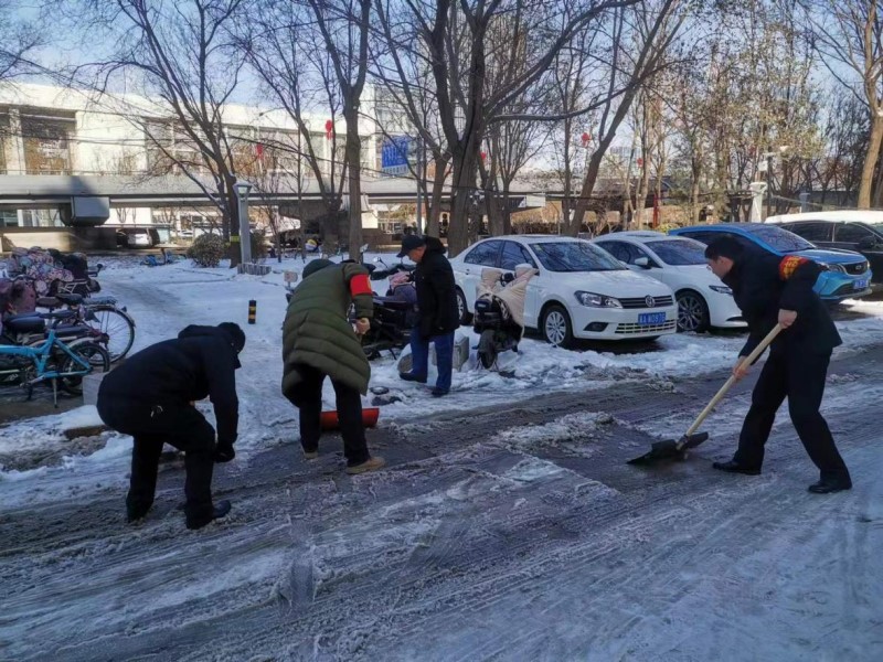 路面積雪經(jīng)過行人及車輛的踩碾及降溫結(jié)冰變得又厚又硬,給清掃工作帶來了極大困難,但集團公司的黨員志愿者們不畏艱苦,干勁十足?;顒又?,大家分工明確、相互配合,利用鐵鍬、雪鏟等工具,有條不紊地開展積雪清理活動,重點對停車場主干道、人行通道及自行車存放處進行了集中清理,確保了日常路面暢通和群眾出行安全。