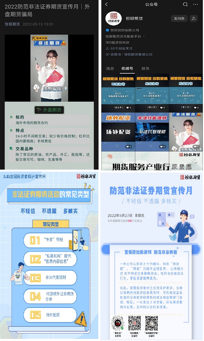 線下活動進行的同時,恒銀期貨公眾號、視頻號也在推進反詐防非的內(nèi)容宣傳,通過圖文講解、短視頻、宣傳海報等多種方式傳播知識,增強投資者反詐意識。