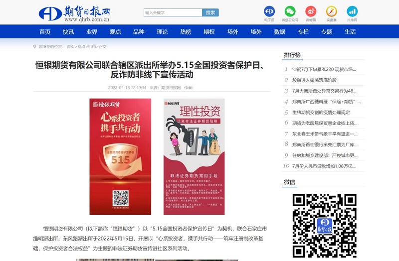 2022年5月15日,恒銀期貨以“5.15全國投資者保護宣傳日”為契機,聯(lián)合石家莊市維明派出所、東風(fēng)路派出所,開展以“心系投資者,攜手共行動——筑牢注冊制改革基礎(chǔ),保護投資者合法權(quán)益”為主題的非法證券期貨宣傳進社區(qū)活動。走進金鼎小區(qū)和東風(fēng)小區(qū),對過往居民進行了非法證券期貨宣傳,同時對5.15投資者保護宣傳日進行普及。