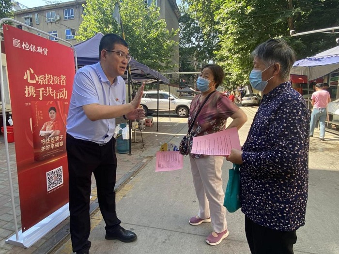為進(jìn)一步深入貫徹落實(shí)處置非法集資部際聯(lián)席會議相關(guān)工作要求,根據(jù)河北省打擊和處置非法集資工作領(lǐng)導(dǎo)小組印發(fā)的《2023年防范非法集資宣傳月活動動作方案的通知》,2023年6月15日,國富投資集團(tuán)所屬恒銀期貨有限公司(以下簡稱“恒銀期貨”)聯(lián)合東風(fēng)路派出所,由恒銀期貨總經(jīng)理湯志江、副總經(jīng)理張南組織公司各部門骨干力量深入社區(qū),開展了防范非法集資的線下宣傳活動。