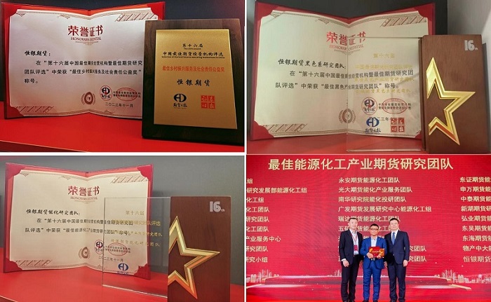 本屆評選于今年4月啟動,在歷時四個多月,經(jīng)過手機投票、專家評審等環(huán)節(jié),恒銀期貨最終榮獲“最佳能源化工產(chǎn)業(yè)期貨研究團隊”、“最佳黑色產(chǎn)業(yè)期貨研究團隊”以及“最佳鄉(xiāng)村振興服務及社會責任公益獎”。
