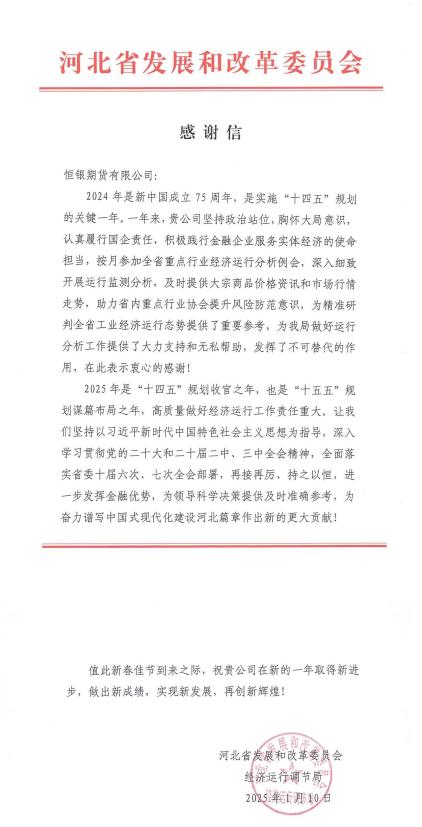 近日,河北省發(fā)展和改革委員會(huì)經(jīng)濟(jì)運(yùn)行調(diào)節(jié)局向恒銀期貨發(fā)來感謝信。信中對(duì)恒銀期貨踐行國有金融企業(yè)服務(wù)實(shí)體經(jīng)濟(jì)的使命擔(dān)當(dāng)、深入細(xì)致開展運(yùn)行監(jiān)測(cè)分析、及時(shí)提供大宗商品價(jià)格資訊和市場(chǎng)行情走勢(shì)、助力省內(nèi)重點(diǎn)行業(yè)協(xié)會(huì)提升風(fēng)險(xiǎn)防范意識(shí)、協(xié)助研判全省工業(yè)經(jīng)濟(jì)運(yùn)行態(tài)勢(shì)等工作表示感謝,并對(duì)恒銀期貨2025年工作提出了期望和要求。